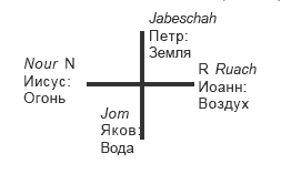 67. "Крест символизирует 4 элемента. Растительное, животное и человеческое царства построены четырьмя элементами. У креста стоят: Ям — вода, Яков; Ноур — огонь, что относится к самому Христу; Руах — воздух, символ Иоанна. Ябешах — земля, скалы, символ Петра". 93(12)