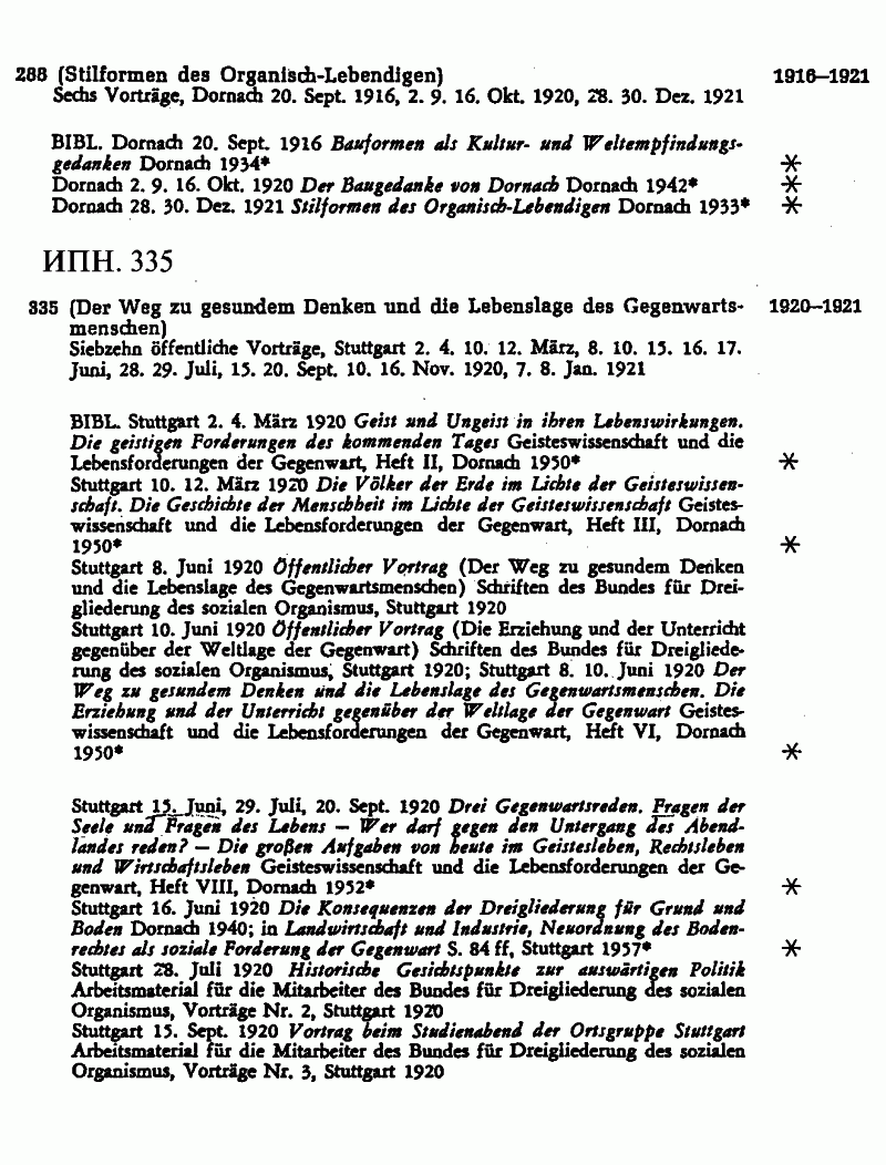Наконец, нельзя не сказать еще об одном факте, о "новшестве", которое "Наследие" воздвигло на пути книг Рудольфа Штайнера к читателю. Вот каково оно. В проспекте Rudolf Steiner—Verlag на осень 2004 г. неожиданно появилось объявление, что примерно с октября того года в продажу поступит новый том — ИПН 335 . Мы говорили об этом томе выше. Было заявлено, что в него войдут 10 лекций (из 18-ти согласно каталогу 1961 г.). Том будет иметь 400 стр. и стоить 74 швейцарских франка, или 44 евро. Вскоре появился проспект Pforte-Verlag (он слит с издательством Рудольфа Штайнера), и в нем уже стояло, что ИПН 335 будет иметь 544 стр. и стоить 96 франков, или 58 евро.